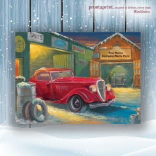 £1.51 - £2.93A snowy scene which dipicts a red convertible in the garage doorway. A mechanic can be seen working away on another car.