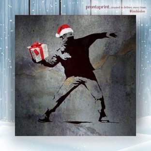 £1.51 - £2.93A contemporary design by the well known street artist Banksy which features a masked man throwing a present decorated with a red bow.