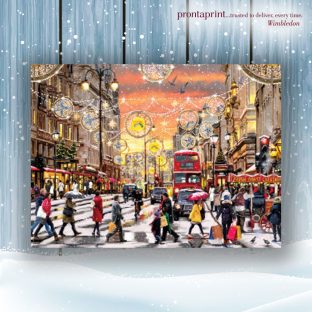£1.51 - £2.93This scene depicts a very busy London street with the hustle andbustle of Christmas shoppers while traditional red London busesand black cabs make their way through the snow.