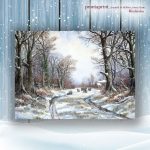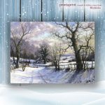 The Tudor half timber cladded cottage is very prominent in this winter scene with the large trees towering above it. The sheep in the lane are bust trying to to eat the grass through the snow. The pale winter sun is going down in the cloudy sky making it a very serene scene.