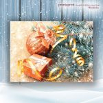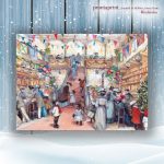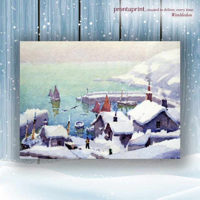 This Christmas card, painted in a watercolour style shows a horbour scene in the depths of winter, the harbour walls covered in snow.