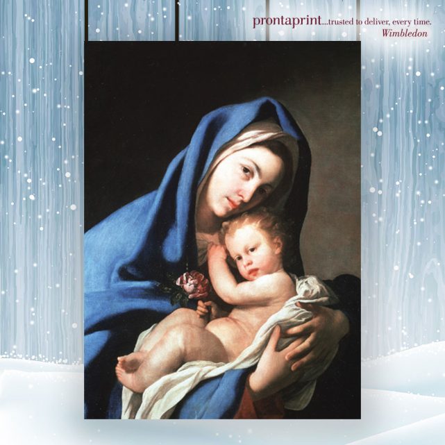An iconic image of Mary cradling baby Jesus. A traditional religious design.
