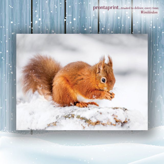A stunning image of a red squirrel, his red coat stands out against the freshly fallen white snow as he crouches to nibble at his food.