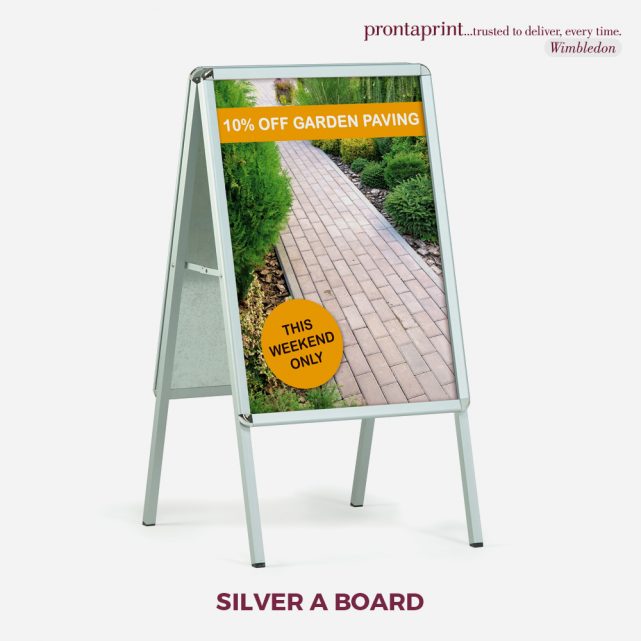 Silver A Board are a great way to display your messages. A strong aluminium and steel construction provides great stability, and they easily fold away for night time storage. These A-Boards incorporate a snap open and close frame system for quick and easy poster changes. They also come with a 0.5mm anti reflective front, a galvanised steel back panel and feature a heavy duty 32mm extruded aluminium profile.