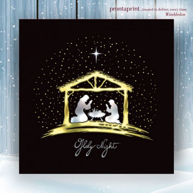 A bright shining star shimmers above the stable in which Mary & Joseph are kneeling over the crib of Baby Jesus